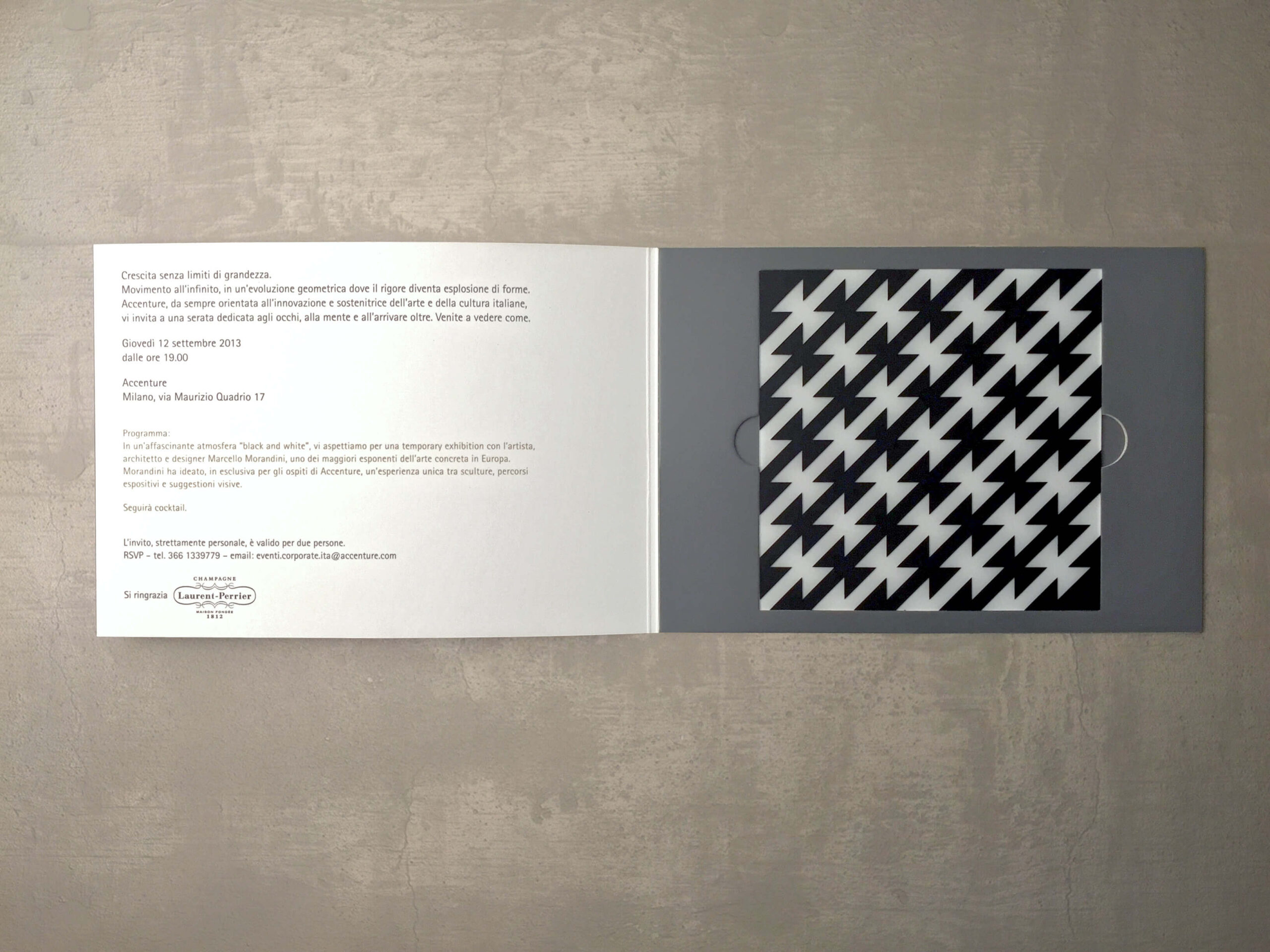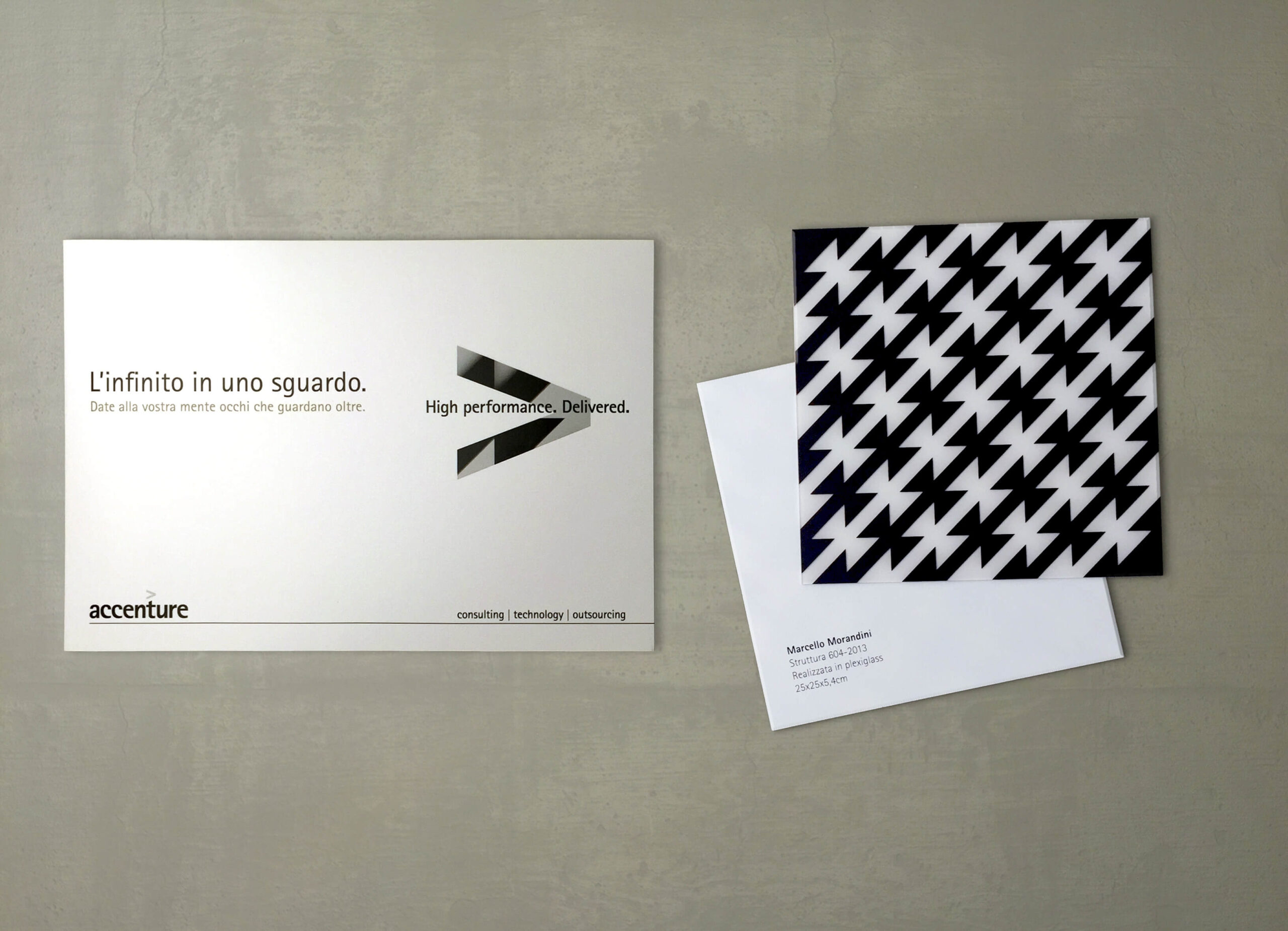 Un “assaggio” dell’arte di Marcello Morandini (con una stampa su plexiglass) nell’invito che Cacao Design ha disegnato per un evento di Accenture, azienda da sempre orientata all’innovazione e sostenitrice dell’arte e della cultura italiane.