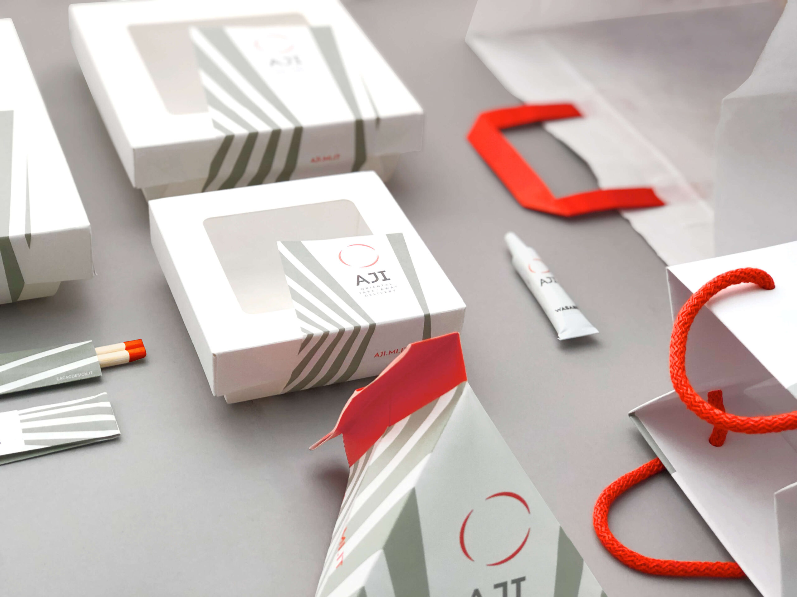 Un progetto di branding totale (dal naming al logo a tutti gli elementi dell’immagine coordinata, tra cui anche un packaging esclusivo totalmente disegnato ad hoc) per Aji.